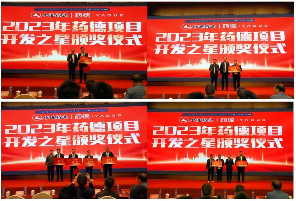 中進市場部部長劉永權宣布《2023年藥德項目開發(fā)之星TOP前三名》,盛邀蘇州華瓴科技有限公司發(fā)展中心總裁盧恩勝、蘇州華瓴科技有限公司發(fā)展中心常務副總裁孟維君、中進人力資源部部長胡耀萍分別為獲得”藥德項目開發(fā)之星”第一名、第二名、并列第三名獲獎省區(qū)頒獎,現(xiàn)場藥德服務商也為獲獎省區(qū)送上特殊禮品,獲獎的優(yōu)秀省區(qū)代表分別作了熱情洋溢的開發(fā)經驗分享。