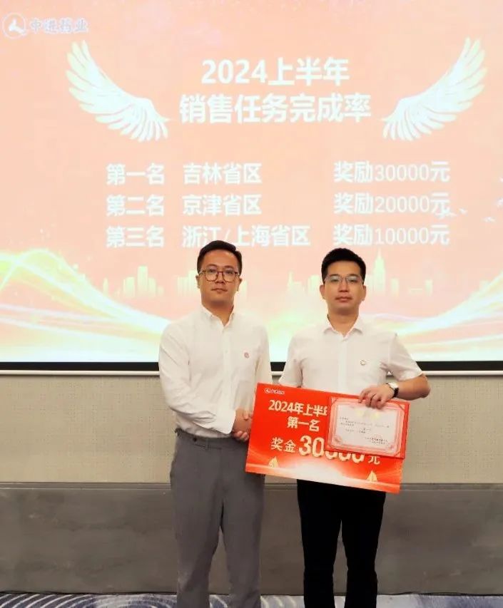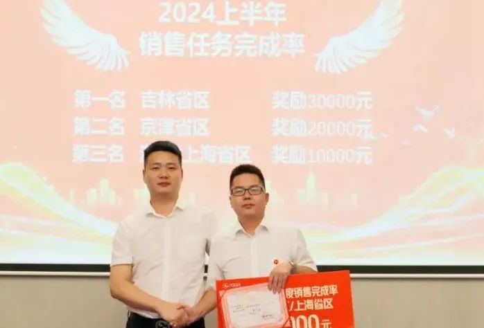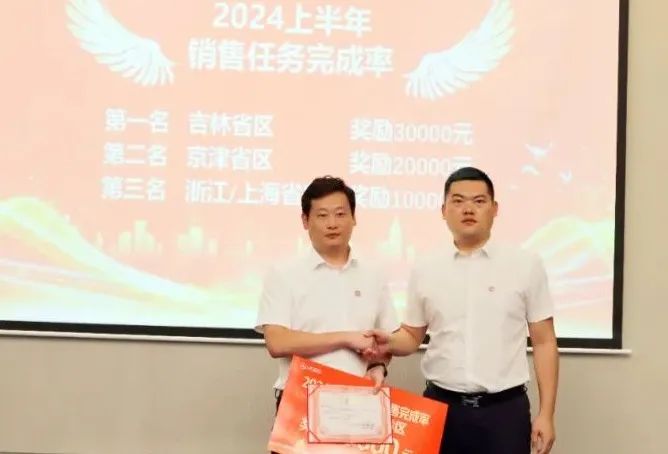 ? ? ? ? ? 銷售管理部熊迪凱從公司上半年各業(yè)務(wù)線以及普藥線各省區(qū)銷售數(shù)據(jù)、各省區(qū)終端占有率、“1936”及兩品同期對比情況、自產(chǎn)品完成情況、TOP20銷售情況、新品下單考核情況、合作商體系重建歸攏情況、ERP直連各省區(qū)出庫情況、三季度任務(wù)等進行通報,對下半年重點工作進行宣導(dǎo)。同時對普藥線各省區(qū)2024年上半年度考核情況進行通報,并對任務(wù)完成率前三名的省區(qū)進行了頒獎。