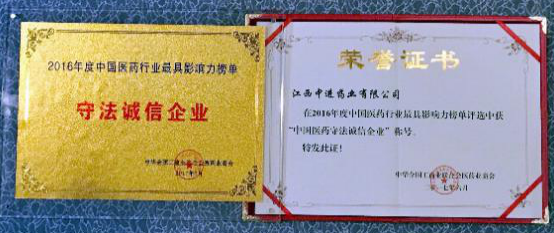 6月,中進藥業榮獲“中國醫藥行業醫藥商業50強企業”、“中國醫藥行業成長50強企業”、“中國醫藥行業守法誠信企業”三項全國工商聯醫藥商會2016年度中國醫藥行業最具影響力榜單。